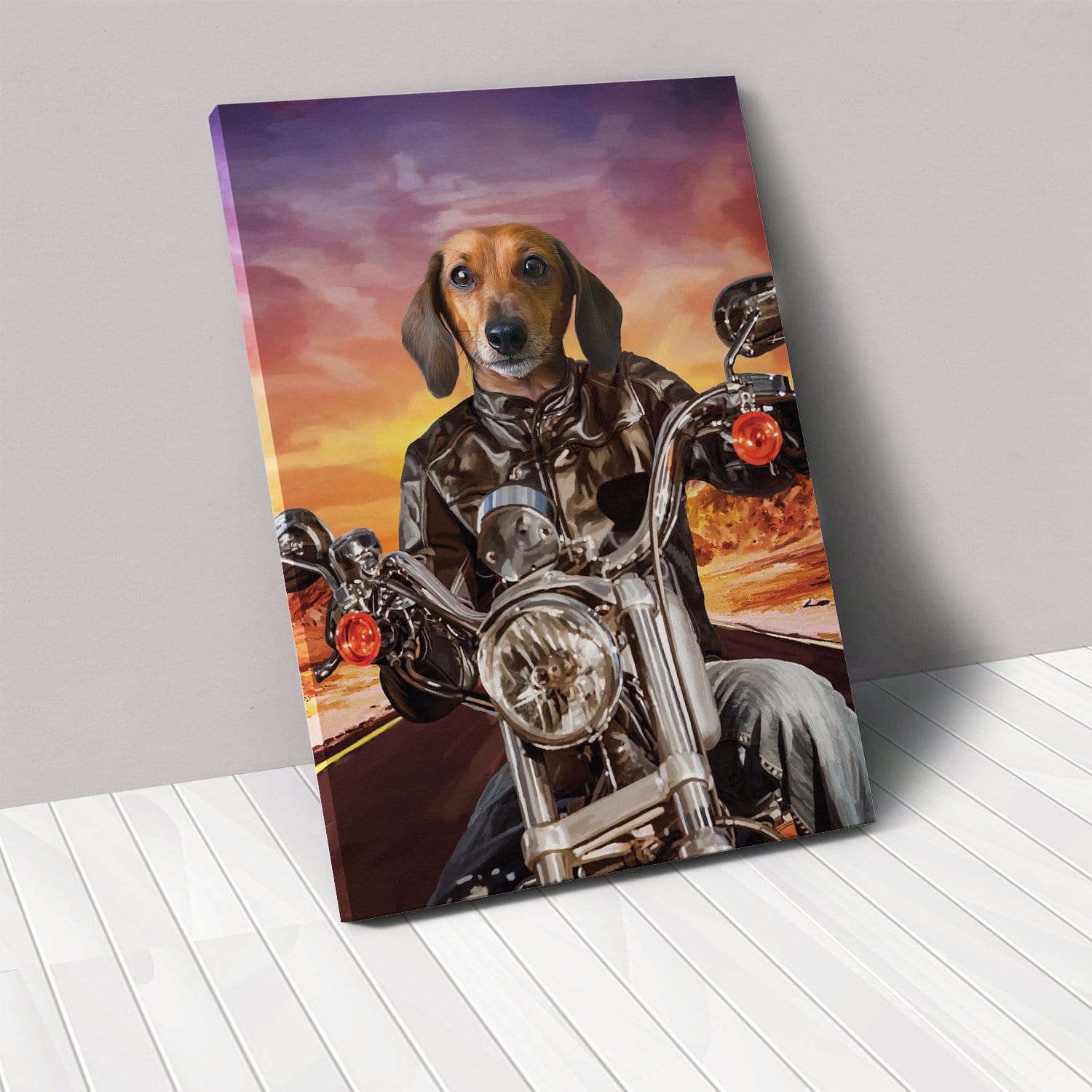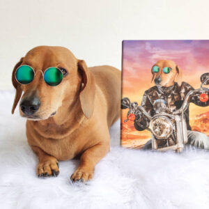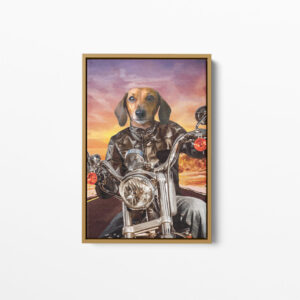 Can you imagine your pet’s proud face printed on to our authentic ‘The Biker’ oil painting style pet portrait? Our beautiful canvases are printed to the highest quality, and hand crafted with sturdy, hard wood frames.